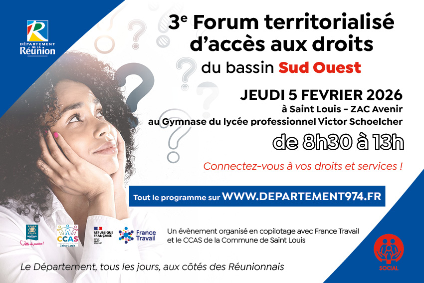 - S’informer sur les aides et dispositifs du Département avec les professionnels des services de Polyvalence Insertion, DINS, CIPI Sud (Académie des Dalons Hors les murs), Service Médico-Social pour l’Autonomie, Aide Sociale aux Adultes, Cécibase pour les déficients visuels, Point Prévention Info Santé, PMI, ADIL974, Amélioration de l’habitat.