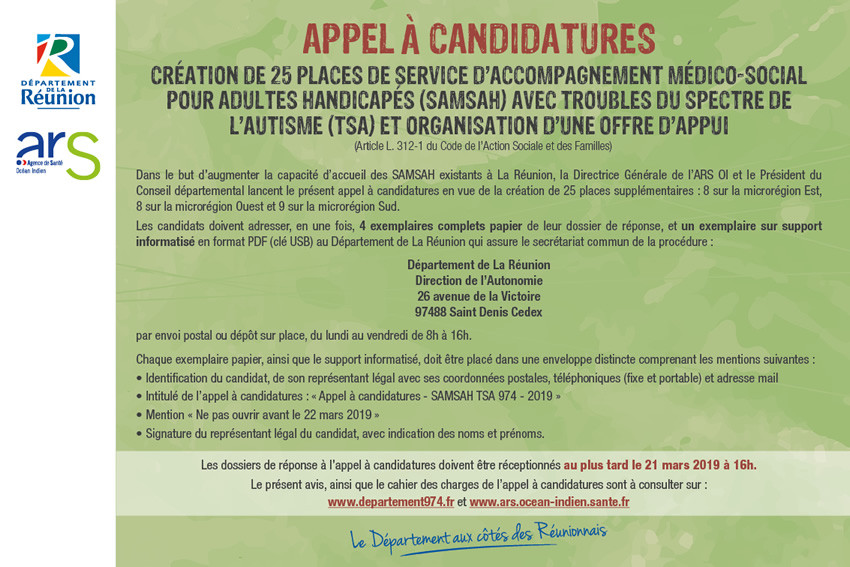 - Intitulé de l’appel à candidatures : « Appel à candidatures – SAMSAH TSA 974 – 2019 »