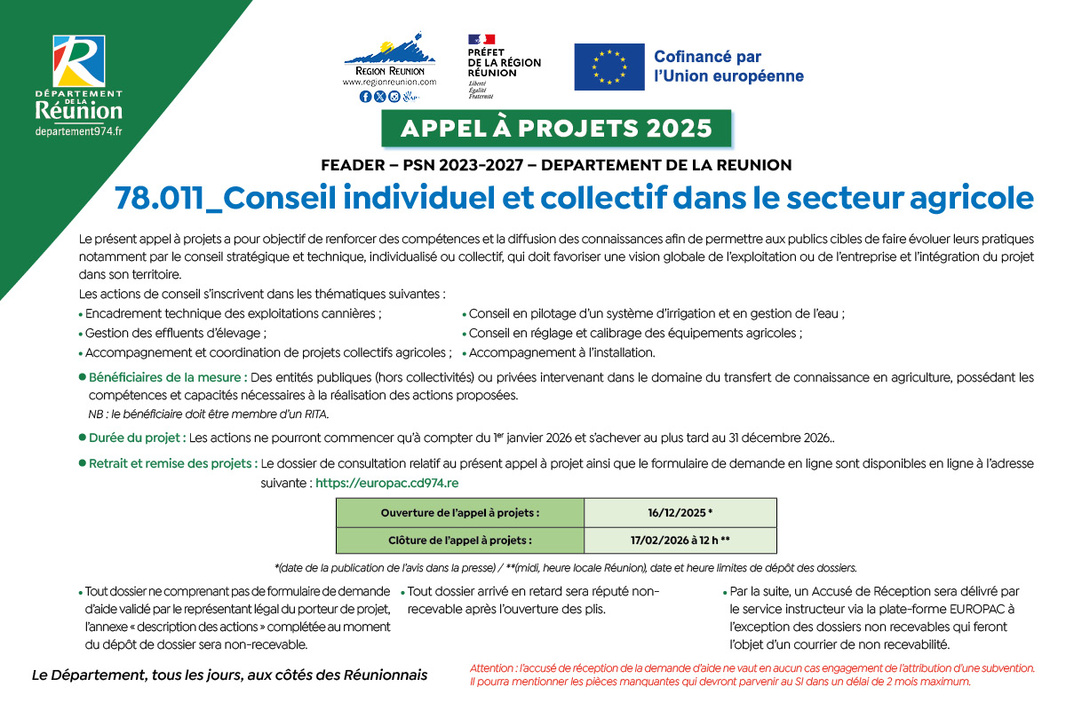 • Retrait et remise des projets : Le dossier de consultation relatif au présent appel à projet ainsi que le formulaire de demande en ligne sont disponibles en ligne à l’adresse suivante : https://europac.cd974.re