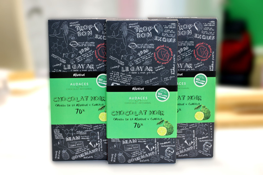 François-Xavier Caussade fabrique du chocolat depuis cinq ans. Cette passion a donné naissance à la marque Audaces, proposant un chocolat aux saveurs de La Réunion, élaboré à partir des produits d’excellence des agriculteurs de notre île. Chocolat au combava, au Faham ou encore à la vanille bleue… autant de créations qui composent une palette de couleurs et de goûts.