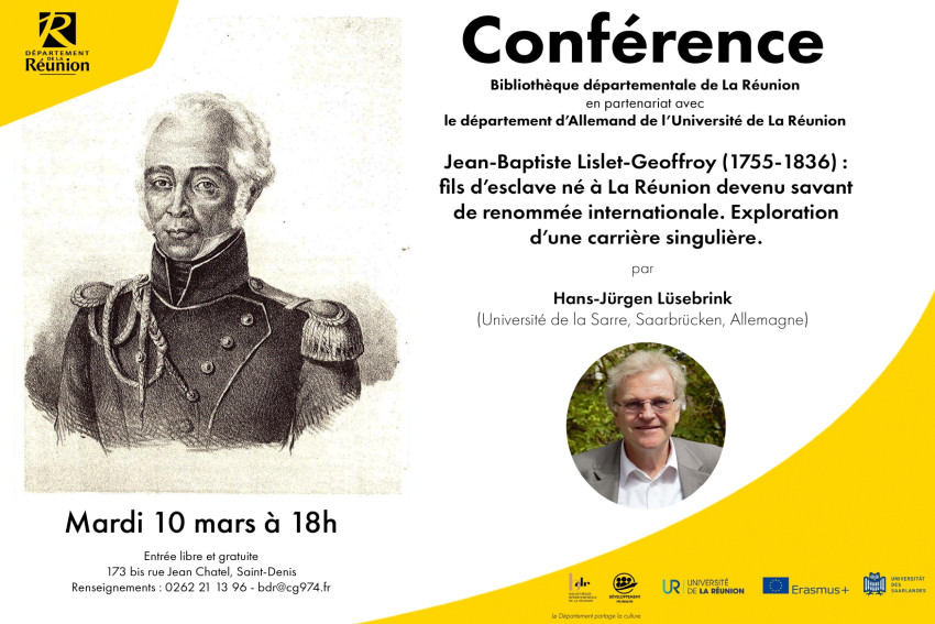 Cette conférence du professeur Hans-Jürgen Lüsebrink (Université de la Sarre, Saarbrücken, Allemagne), en partenariat avec le département d'Allemand de l'Université de La Réunion, se propose de mettre en relief et d’explorer, à partir de documents d’archives nouveaux, la carrière singulière de Jean-Baptiste Lislet-Geoffroy : né à La Réunion comme fils d’une esclave sénégalaise et d’un ingénieur français, il entama, grâce à d’heureuses circonstances et ses talents exceptionnels, et après avoir reconnu officiellement par son père, une carrière de savant et d’ingénieur qu’il poursuivit à l’Isle de France (Ile Maurice) sous la domination anglaise.